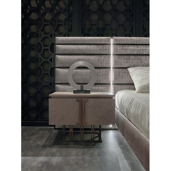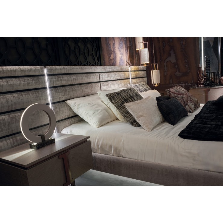 Structure blockboard and poplar plywood,padded ashlars with polyurethane and hand made fabric SGF 0967/10Cat A, vertical LED-illumination, bed spring dimensions 180x200, the base is available with or without lateral wings (behind beside tables) , Finishlaquered inserts Cold Black, L.351 P.218 H.128.