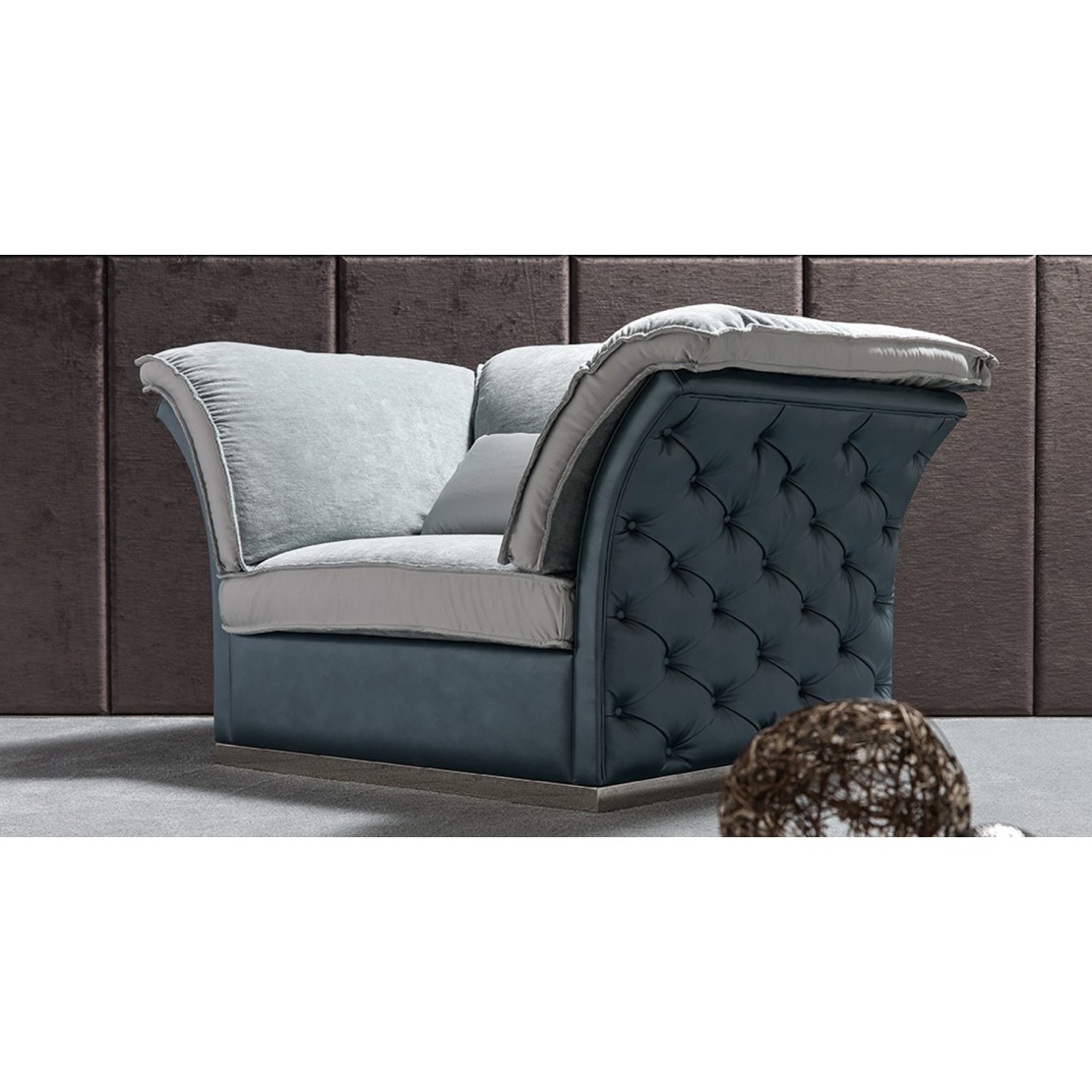Armchair + 1 Tiago cushion, structure in solid poplar, Capitonnè padding, cushioning with non-deformable rubber, upholstered in Luxury 9130 leather structure fabric, Murano C/21 seats and backrest, Nikel baseboard, L.104 P.142 H.88.
