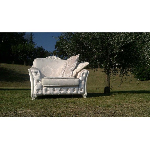 Hermes armchair in carved wood with a white patinated finish made of damask and velvet fabric, complete with 2 cushions, 1 round and 1 square with curled profile, L 126 P 106 H 110 .
