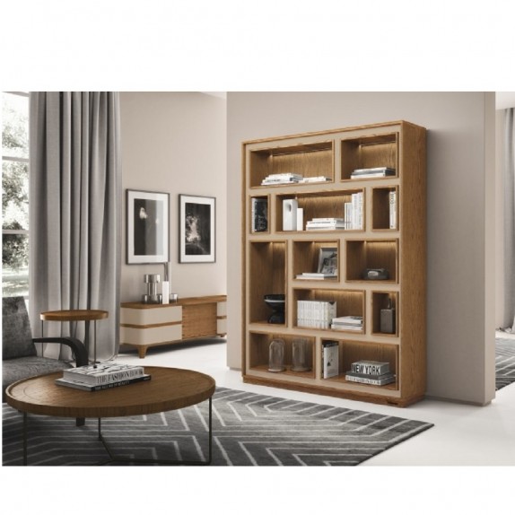 The Veda bookcase from Le Fablier's Fiori di Loto collection is an open bookcase (without LEDs) inspired by the 1930s in a Nordic style. It is made of oak and can be customised with an all-wood finish: white, ivory, dove grey, ginger, tobacco, ash; or two-tone with wood and grey or ivory lacquer. You can also have two-faced. The measures are: W 147 cm D 40 cm H 199 cm. In the photo: ginger essence and ivory lacquer.