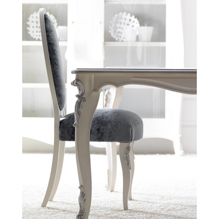 Charlotte chair, structure in solid beech, decorated with carved details, seat and back padded and covered in Yeti Pyrite 470-02 fabric, sand finish, glitter details, L.53 P.54 H.109.
