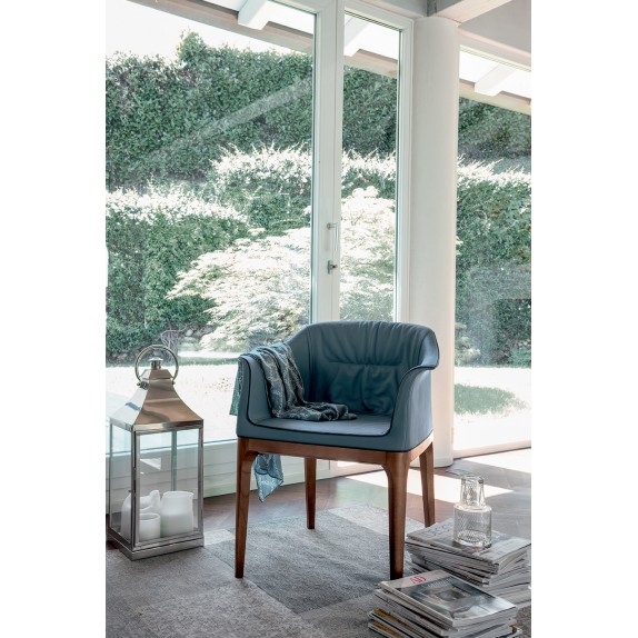 The cold foamed polyurethane of the structure makes Mivida an exceptionally comfortable chair. Angelo Tomaiuolo's design is refined and elegant, both in the version with and without armrests. The upholstery in leather, eco-leather, grain leather or nubuck leather is enhanced by the refined creasing.