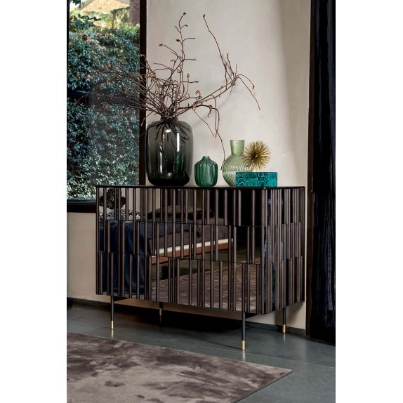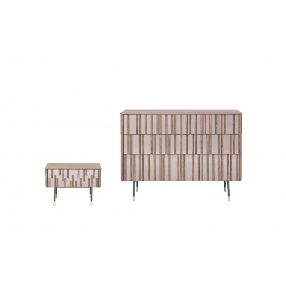 A complete and extremely elegant night program. Drops of solid wood applied with extreme care to the mirror effect doors. A shaped and rounded top, fine and sophisticated; a metal structure with gold finish inserts. All this to leave nothing to chance.