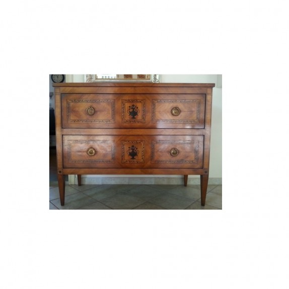 Dresser 301 Louis XVI structured in cherry wood, equipped with 2 drawers, wonderful decorations inlaid in ebony, cherry finish. W.124 D.53 H.98.