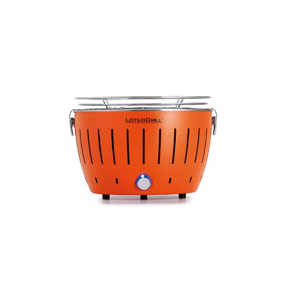 Steel and plastic grill, impact-proof. Stainless grill and bowl, 2 rotors powered by batteries,external covering made of steel and it is dust-coated,charcoal's burning time from 40 to 90 minutes,according to the kind of charcoal. Container capacity 400 g, you can add charcoal whenever you want,it also has a lateral locking system, orange coloured. Size:upper D.292mm, lower D.220mm,H.21 , grill D.258mm.