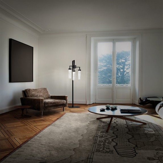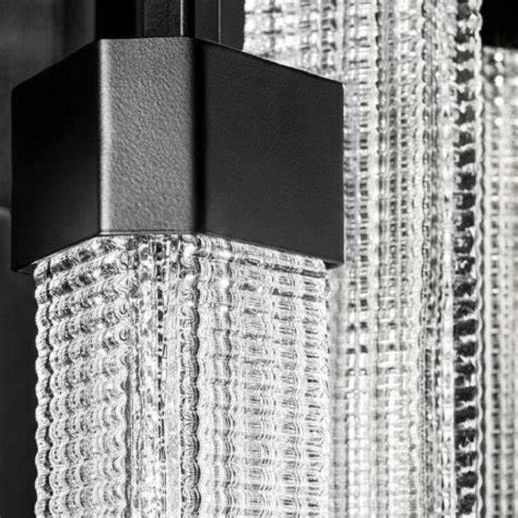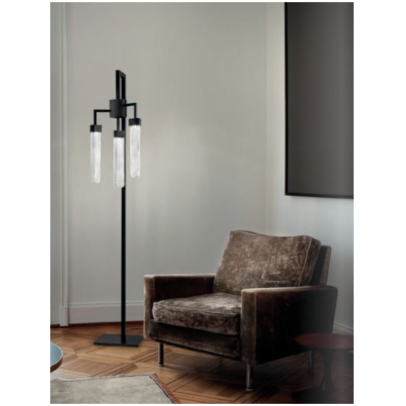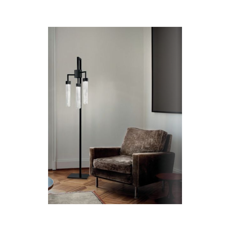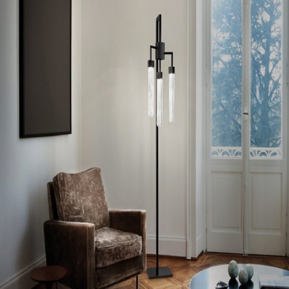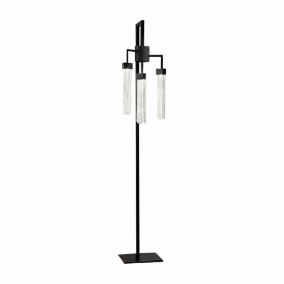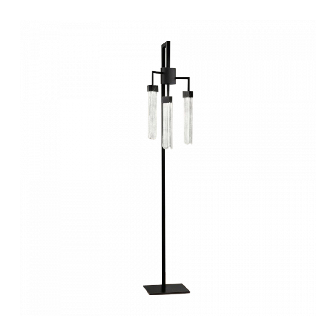 This modern floor lamp features three clusters of textured plate glass dynamically hanging from a structure at different heights. It is richly decorated with the highest quality glass and an embossed black finish for the metal structure.The lamp structure has an embossed black finish. This elegant lamp will not only lights up your room with its LED light source but also adds a contemporary detail to any modern space.