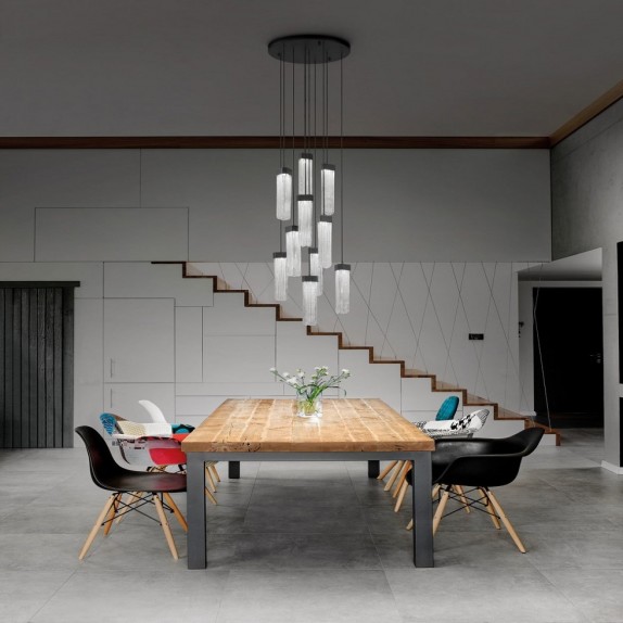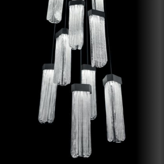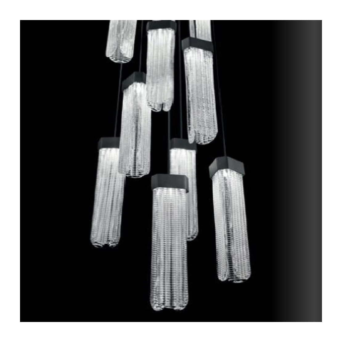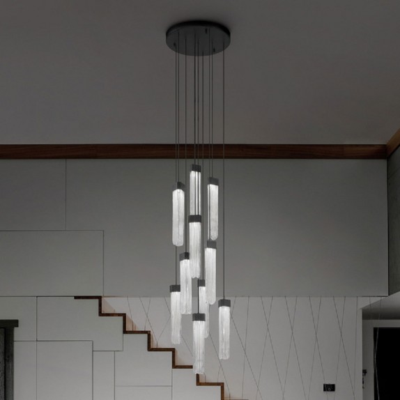 This Blake linear multi light pendant features ten clusters of textured plate glass suspended from a circular black canopy from the ceiling at different heights. This fixture has an embossed black finish. This elegant chandelier will not only lights up your room with its LED light source but also adds a contemporary detail to any modern space.