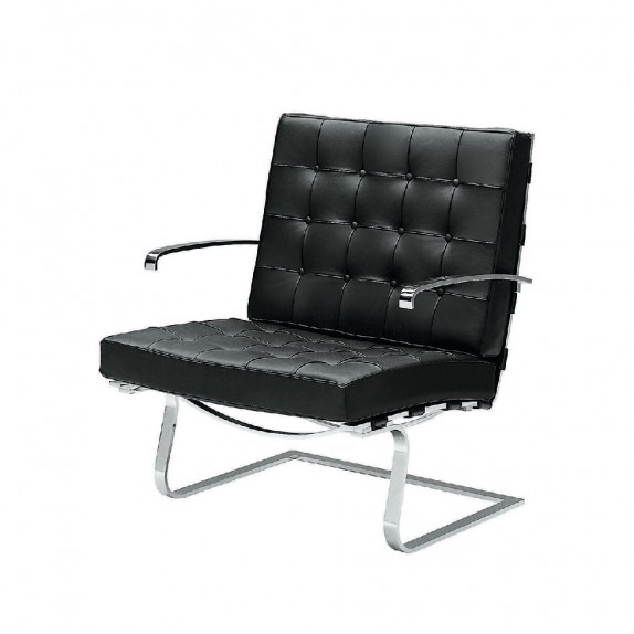 Armchair 365 MIES VAN DER ROHE L. - MVSEVM. Chrome-plated flat steel frame. Padded seat and back cuschions. Hide straps. Dimensions:L 77 cm P 78 cm H 88 cm.