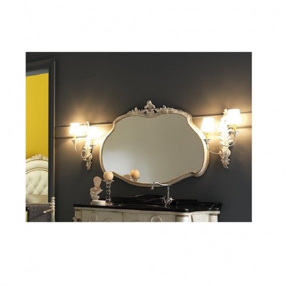 Mirror 3671, wooden structure, natural mirror, carved decorations, central carved decoration with floral motif. Antique white, moon silver and grey color finish. L.123 H.86.