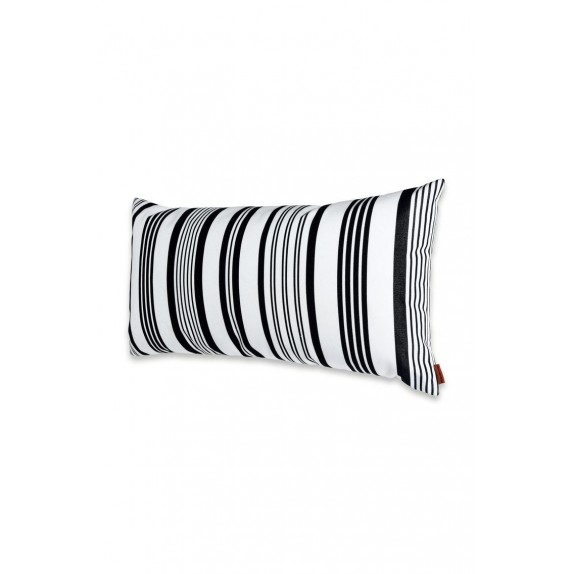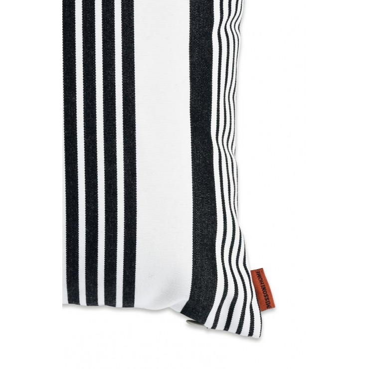 “Rainbow” cushion from the “outdoor” collection. The cushion is in waterproof fabric, printed in alternating black and white stripes.