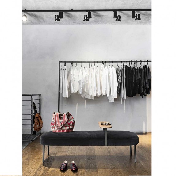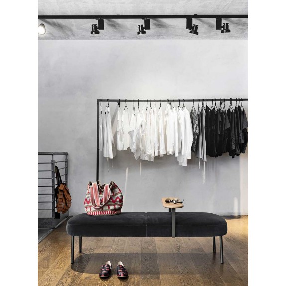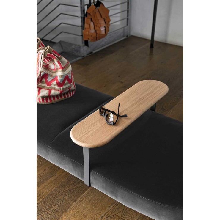 The RAKU collection of upholstered seats - which includes armchair + pouf, sofa, chair and bench, has a contemporary and essential image. Seat and back are clear from simple and rounded volumes. The foot, also essential, is formed by a vertical tube that seems to be resting only on the outside of the volumes. The upholstered bench also includes a wooden armrest that divides it across creating a functional support surface. Available with leather and fabric cover, RAKU is perfect to give a touch of comfort to the living area, as the sleeping area.