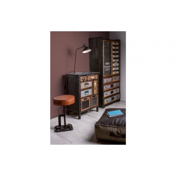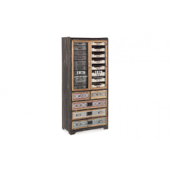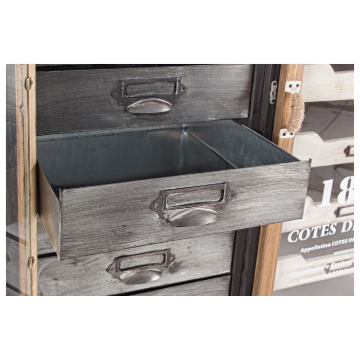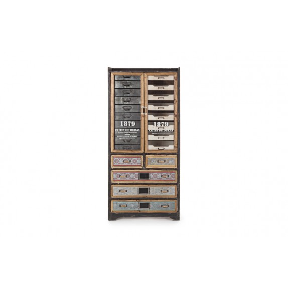 Pine wood structure. Backrest in plywood. Drawers in zinc and pine wood. Door compartment with drawers. Iron handles. Finish based on nitrocellulose.