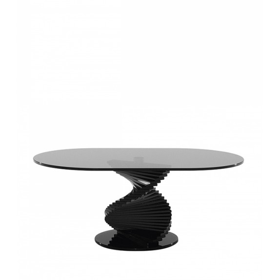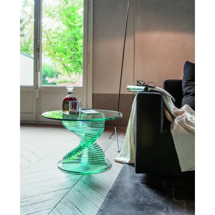 A spiral that develops upwards, with glass plugs that refract the light and play with reflections and colors. Ariel combines the roundness of the base and top with the icy texture of the glass.