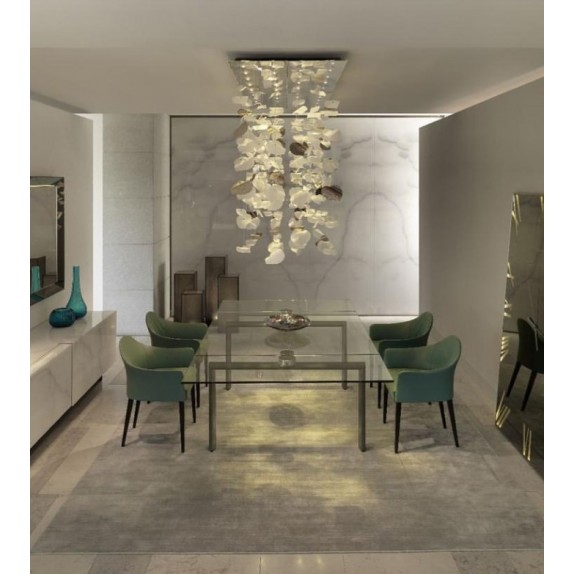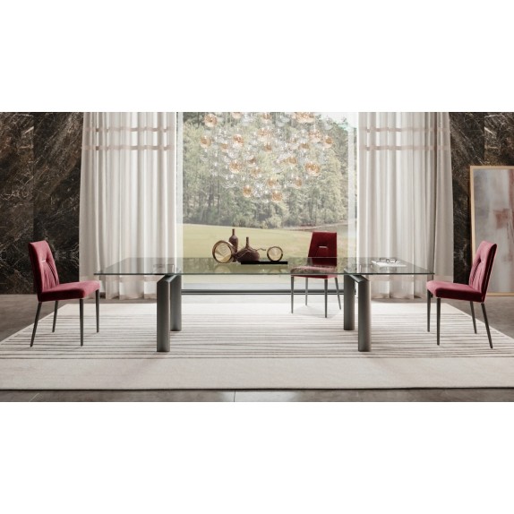 Extendable dining table with 15 mm thick tempered glass top with polished edge.