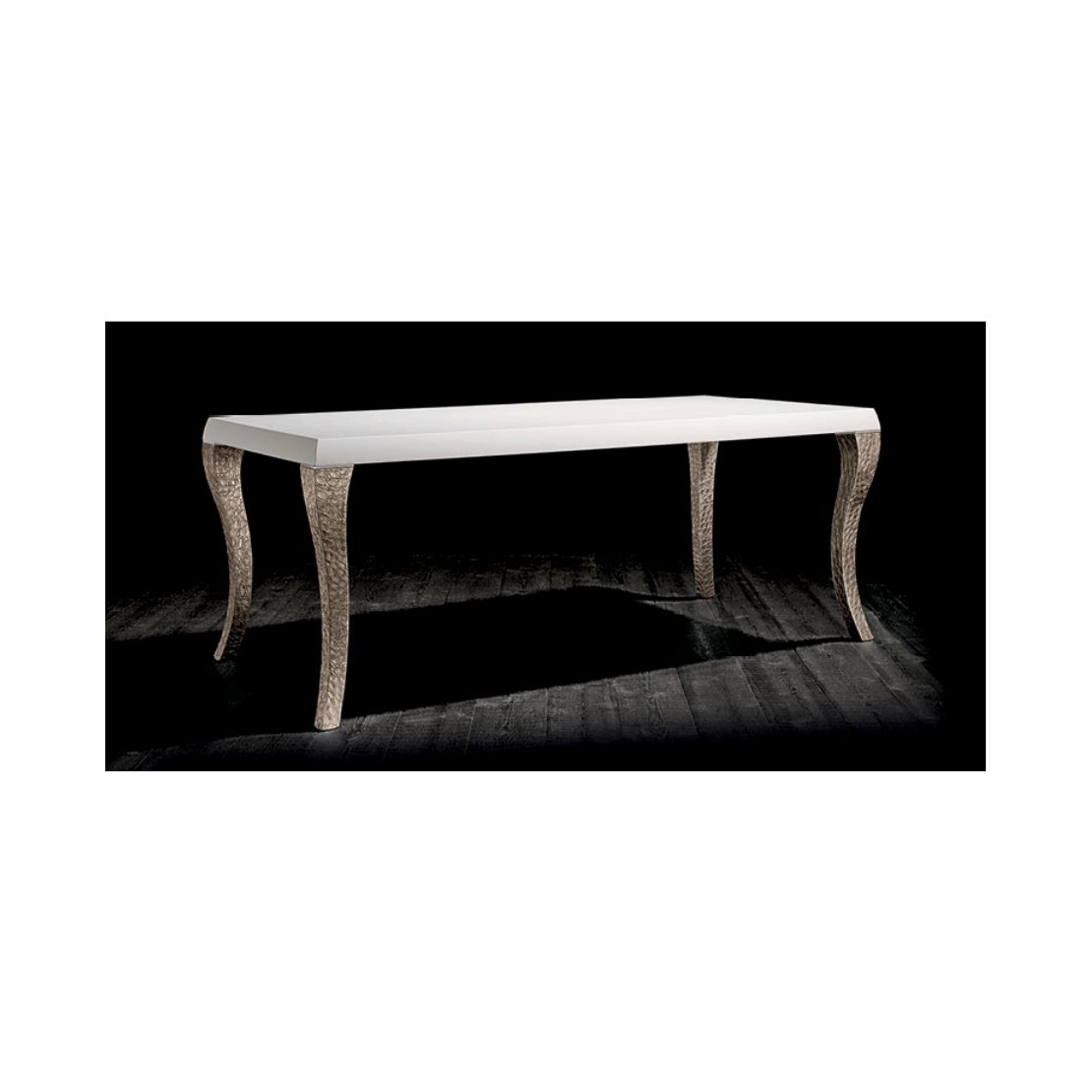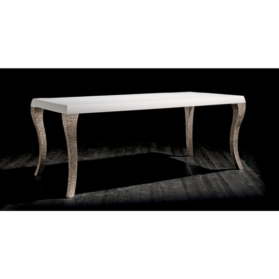 Table 9121 LC /200.100, wooden structure, glossy white lacquered top, legs covered in platinum-finish "croco" printed leather, L.200 P.100 H.80.