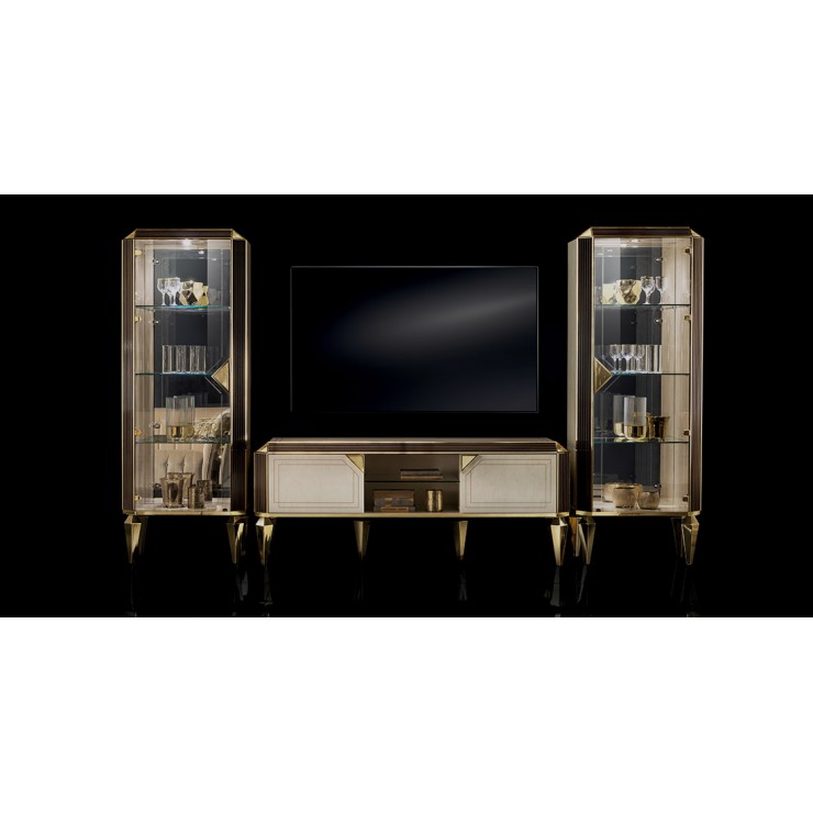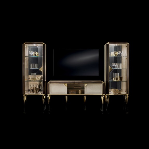Three elements in full harmony with each other solve one of the most complex spaces to manage in the furniture of a house, the TV area. The transparency of the side windows balances the full geometry of the low cabinet, the use of gold finishes and triangular handles, iconic shape of the collection, complete the composition.