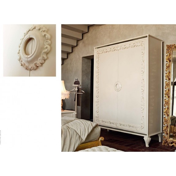Wardrobe with 2 coplanar sliding doors collection Volpi carved doors with motif in C20 finish lacquered cream the craftmanship with feet capri carved with flowers, central handle between the 2 doors made of carved wood. W.171 D.57 H.222 cm.