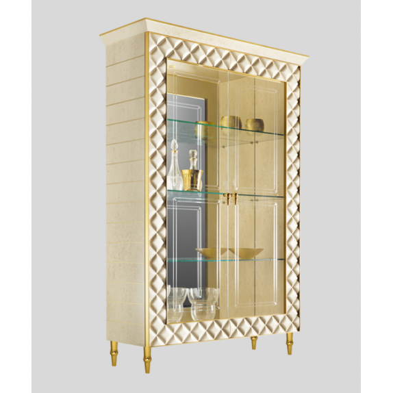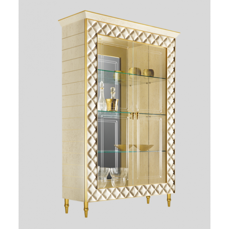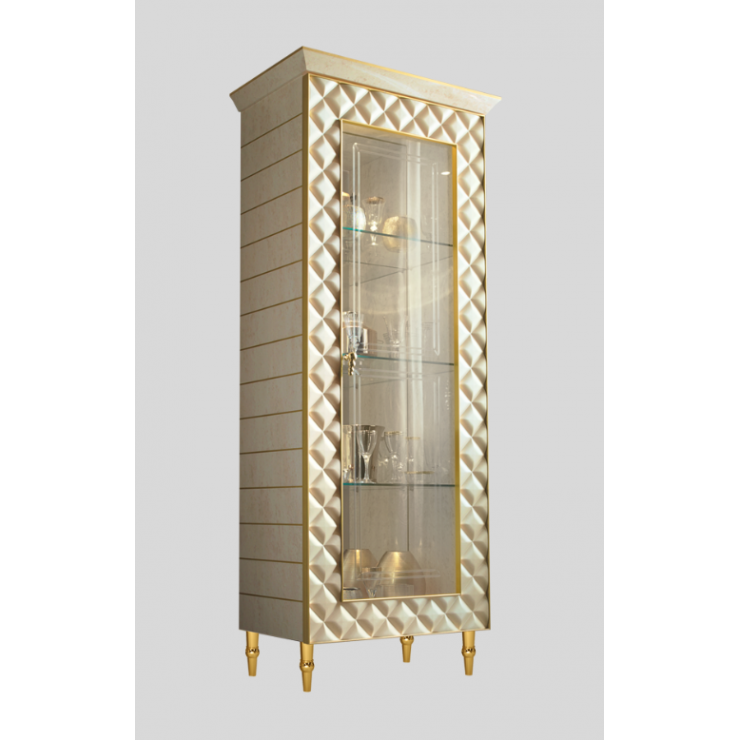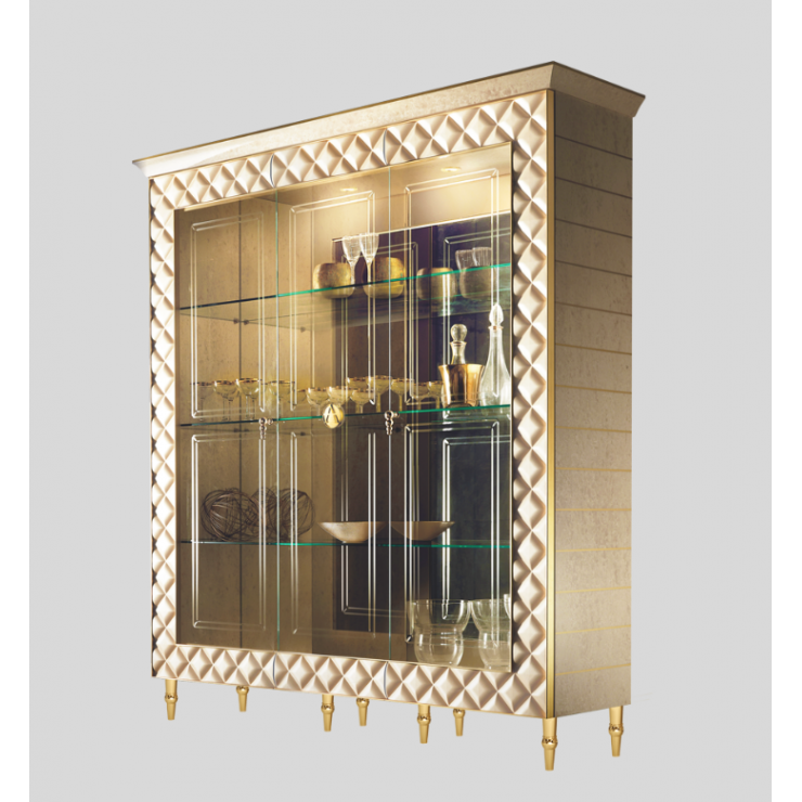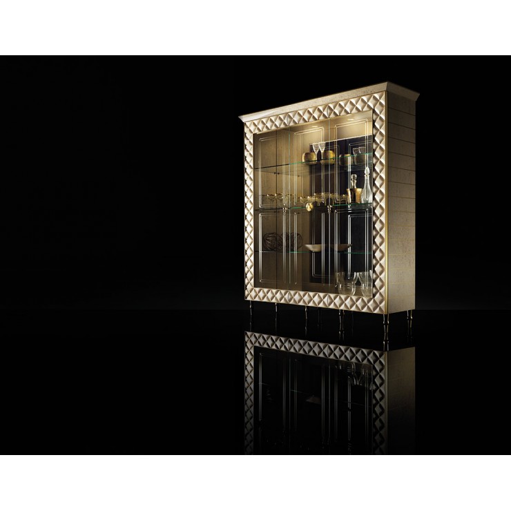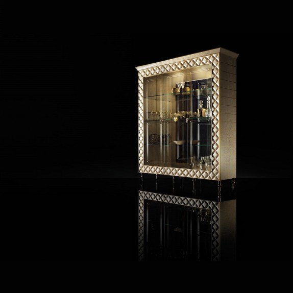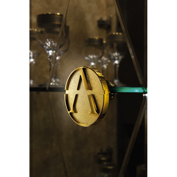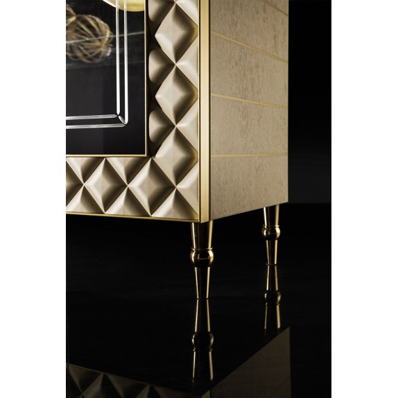 Les vitrines de la collection Sipario sont des éléments qui peuvent être utilisés comme une pièce unique, combinées entre elles, créant une séquence élégante et raffinée, ou en combinaison avec d’autres éléments pour inventer de nouveaux espaces de mobilier. Un volume à la géométrie essentielle, décliné en différentes tailles, qui s’enrichit du délicat travail décoratif en losanges du cadre extérieur et de la luminosité de la grande surface vitrée centrale. Les pieds dorés soulèvent toute la structure, une touche de légèreté qui s’adapte à chaque décor architectural.