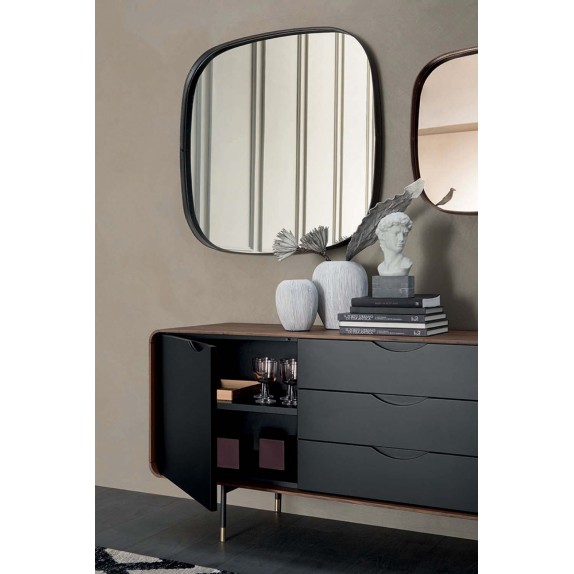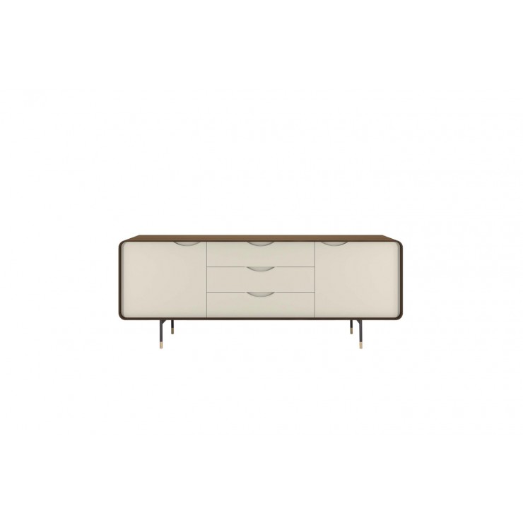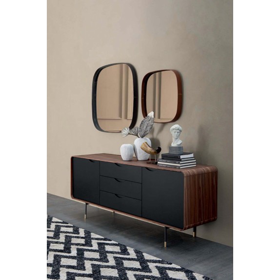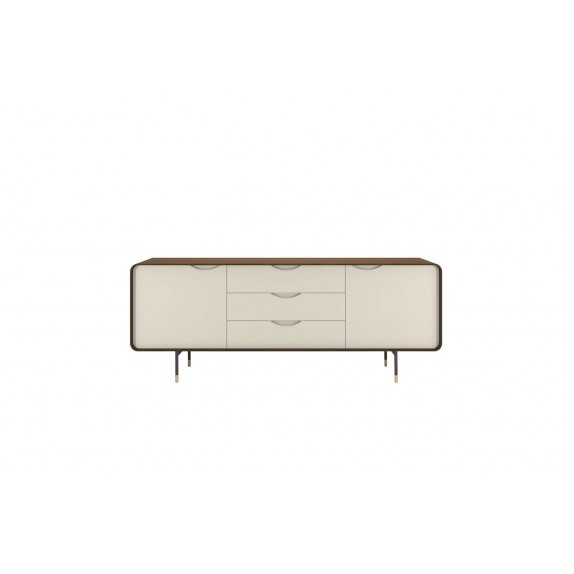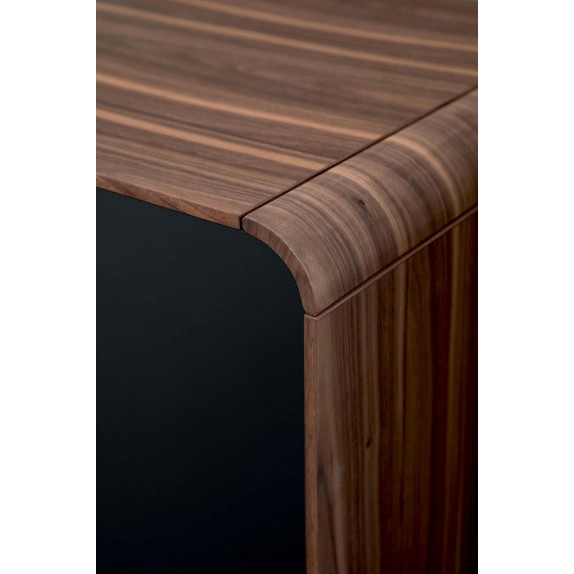 Un design bien équilibré où le bois courbé abrite des portes et des tiroirs laqués.Les détails font la différence, la rendent unique et adaptée à votre living