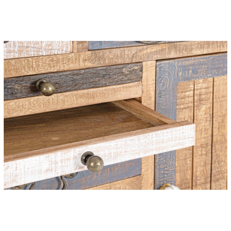 Structure en bois de Mango ,Dossier et fond de tiroirs en contreplaqué Poignées en Métal-.Laiton- Cèramique - Finition rustique naturelle , peinture à base d'eau d'acqua.