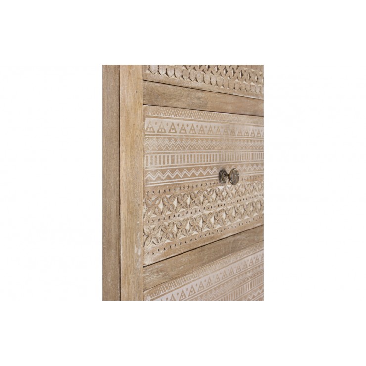 Structure en bois de Mango avec décorations en bois sculptés à la main , Dossier et Fond de tiroirs en bois MDF. Finition à base de nitrocellulose. Porte avec étagère Poignées et pommeaux en Laiton .