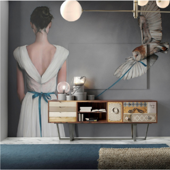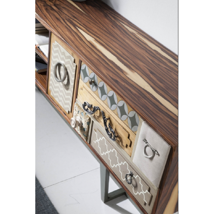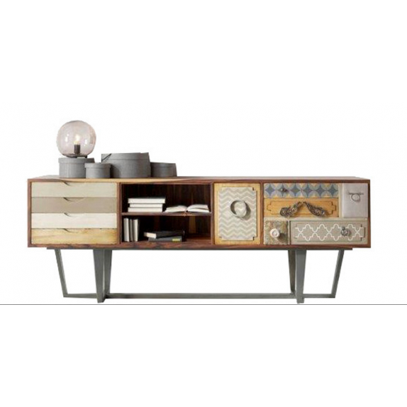 Table TV punk avec 2 portes, trous et 4 tiroirs serrés. Fabriqué en noyer avec pieds et façades en bois de tilleul. La base est en bois de hêtre avec une finition gris doré. Selon le sol, vous devrez peut-être le fixer au mur. Disponible dans toutes les tailles et finitions. Nettoyage avec un chiffon humide.