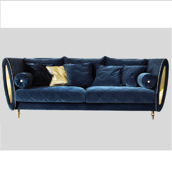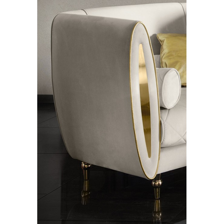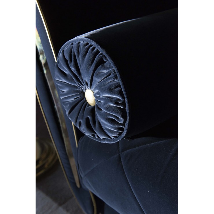 L’élément qui résume pleinement le style de la collection Rideau est sans aucun doute le sofa. Confortable, élégant et raffiné est la pièce principale de la zone de vie. Le dossier haut le caractérise en manière décidée et ultérieur dynamisme est conféré des ellipses en laiton des accoudoirs, un choix stylistique qui, avec une pincée d’excentricité, rend spécial chaque pièce. La couette à losanges rappelle le style décoratif des autres éléments d’ameublement et les bordures en cuir doré guident le regard jusqu’à la frise centrale en laiton.