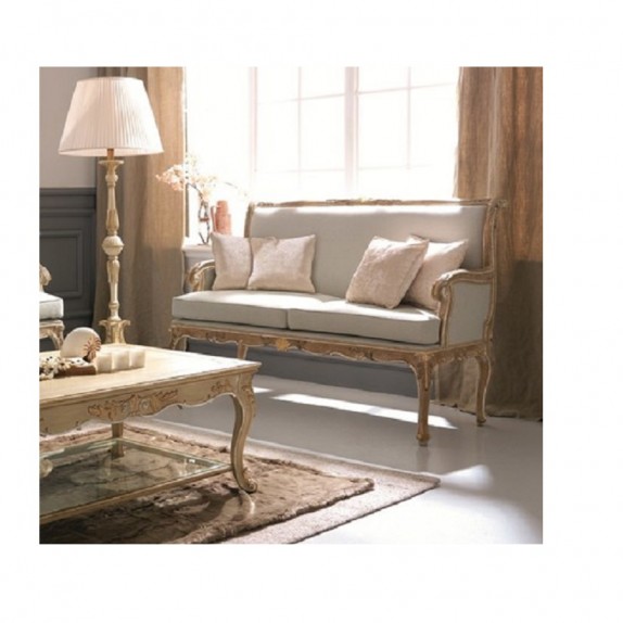 Canapé 3680 avec structure en bois massif, revêtu en tissu Avignone 2556-600 et avec décor sculpté. Finition chêne blanchi argent et "mecca" antique. L.153 P.68 H.108.