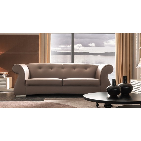 Canapé 649-Q, 3 places + 3 coussins 40x40, piètement en peuplier massif, rembourrage en caoutchouc indéformable, revêtement en cuir, pieds tulipier massif, finition pieds blanc brillant, finition cuir Lena 3322 gris tourterelle. L.253 P.110 H.86.