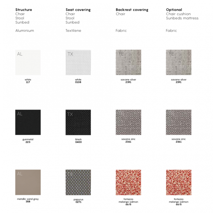 L'allonge en Textilene de la plus haute qualité (en finition Blanc, Noir ou Papyrus) et le cadre en aluminium peint en poudre époxy disponible en 3 finitions différentes (Blanc, Gunmetal et Grey Sand Metal), confère à votre chaise longue légèreté et maniabilité tout en étant à l'épreuve du temps.