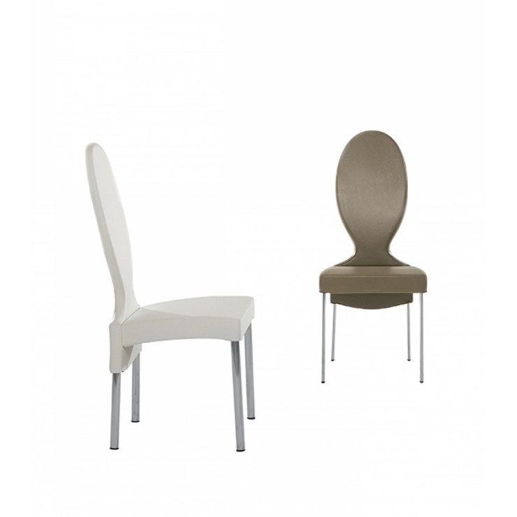 Chaise en polyuréthane expansé,revêtement en cuir, éco-cuir, Verbène ( tissu) Ninfé ( tissu). Une grande variété de finitions se combine parfaitement au Dossier qui a une forme particulière et féminine qui allie magie contemporaine et magie d'antan