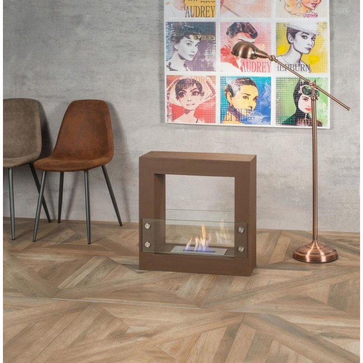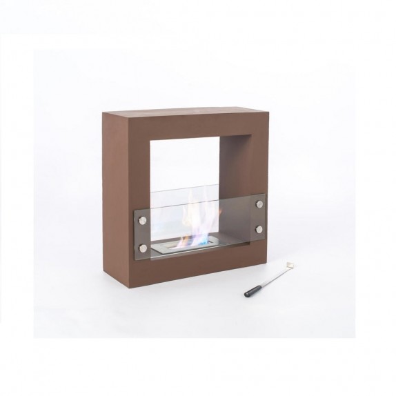 Cheminée au bioéthanol desol en magnésie, finition effet rouille et verre trempé. Brûleur double couche de 1,5 l et outil de contrôle de la flamme.