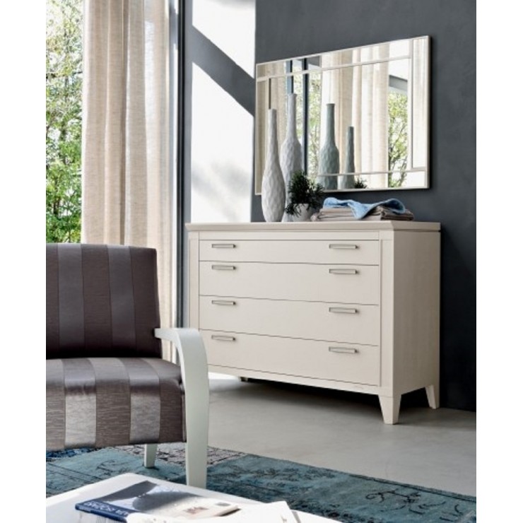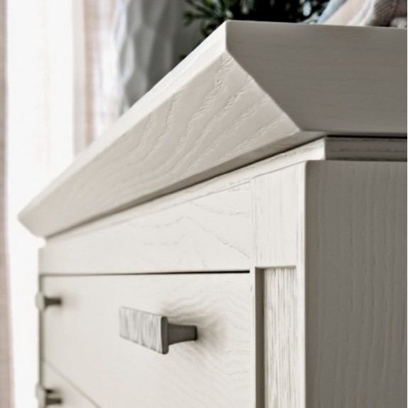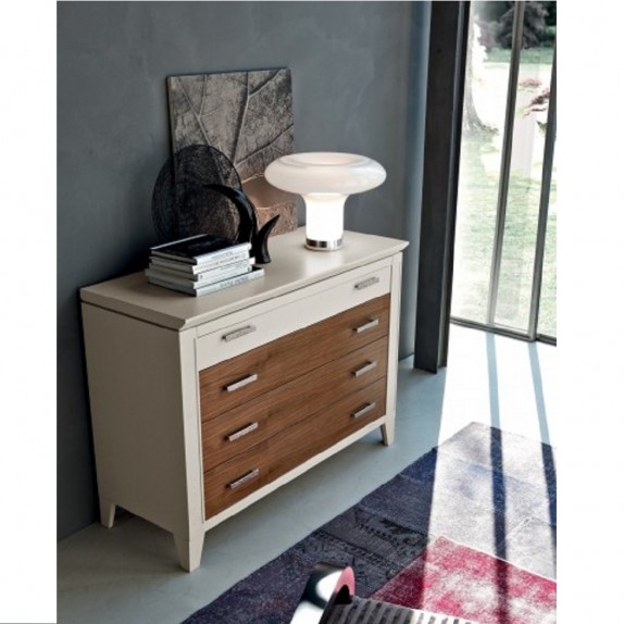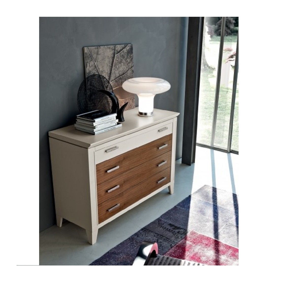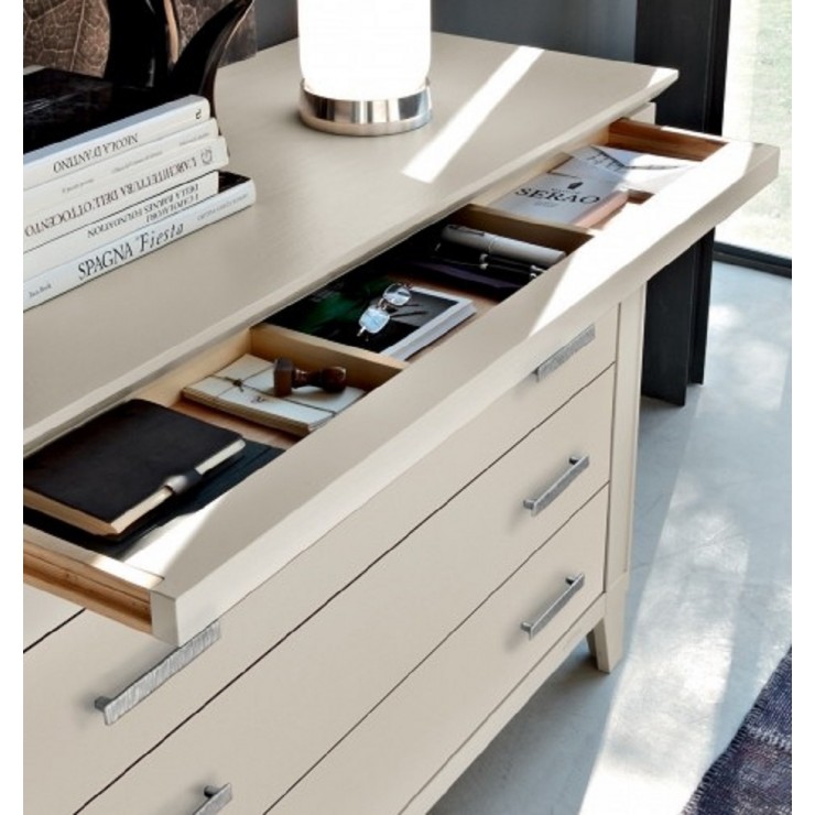Commode Lauro. Collection Melograno- Le Fablier, à 4 tiroirs et 1 secrétaire, structure en frêne. brossé blanc et façade Canaletto. Dimensions : L 132 cm P 53 cm H 96 cm.