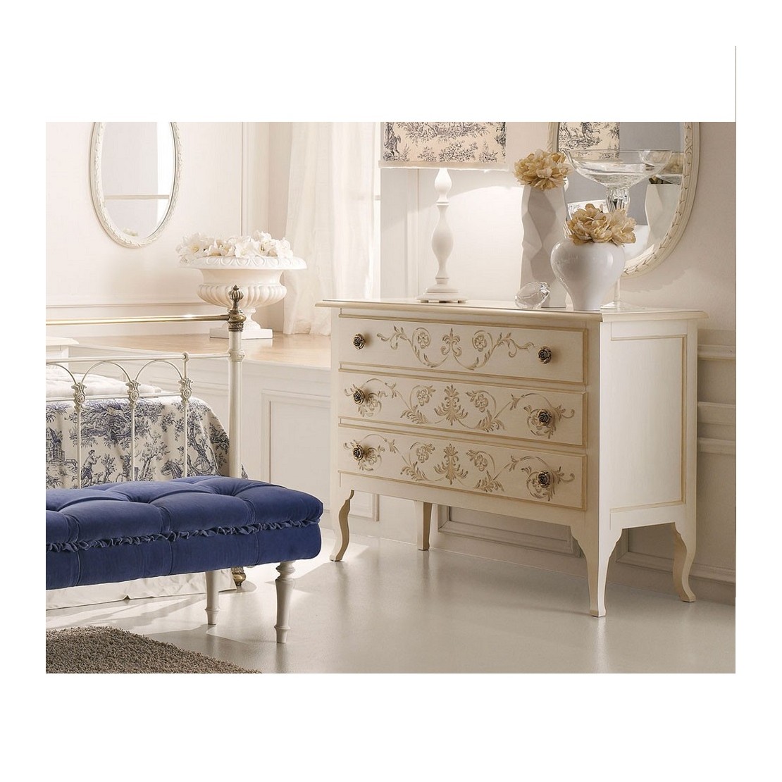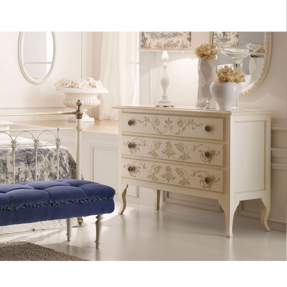 Commode Orlean, structurée et réalisée en bois ,dotée de 3 tiroirs ,décorés et peints à motif floral. Poignées en forme de rose Finition blanc vieilli décoré , L.122 P.49 H.91,5.