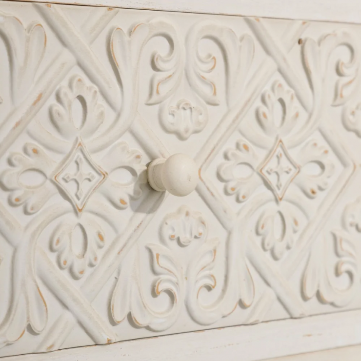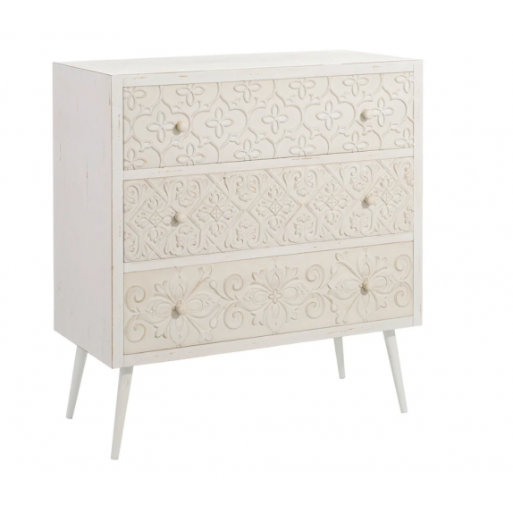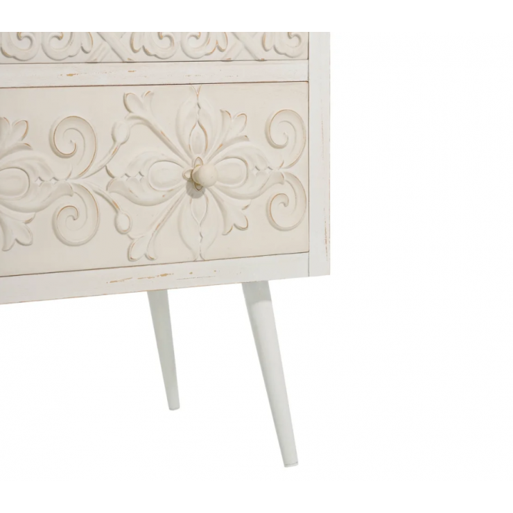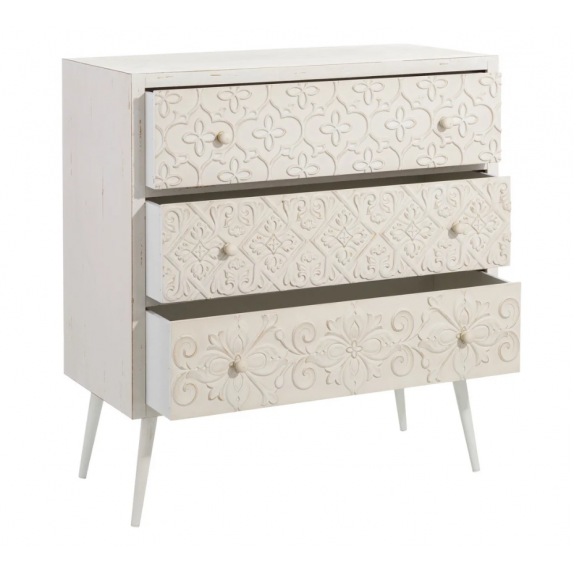 Commode 108414 structure en bois avec pieds en fer, 3 tiroirs avec décor floral, finition crème, L.75 P.35 H.80.