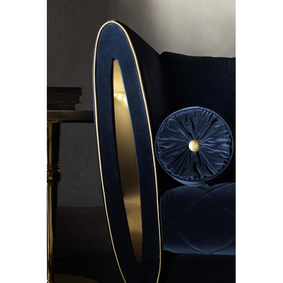 Les fauteuils de la collection Sipario ont une ligne synthétique et raffinée. Les sièges sont larges et profonds et équilibrent la ligne continue du dossier qui continue, dans une courbe douce, pour devenir accoudoir. Une continuité du signe qui les rend compactes et adaptées à différents contextes, des solutions traditionnelles aux jeux de contrastes plus intenses, en exploitant l’élément contemporain de l’ellipse en laiton qui caractérise son accoudoir. Les fauteuils s’agrémentent ensuite de coussins souples qui, en plus d’avoir un aspect strictement fonctionnel, deviennent à leur tour des éléments décoratifs comme dans le cas du coussin qui entoure l’assise et crée un contraste agréable avec les tons dorés du coussin carré.
