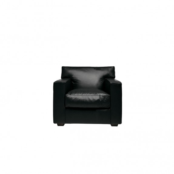 Fauteuil 611 design Frank J.M. par MVSEVM. Il est en bois recouvert de mousse, coussin de siège en mousse et plume d’oie revêtement en cuir, déhoussable, et pieds en noyer national traités naturellement avec une finition cireuse. Dimensions L 90 cm P 89 cm H 86 cm.