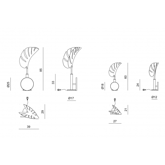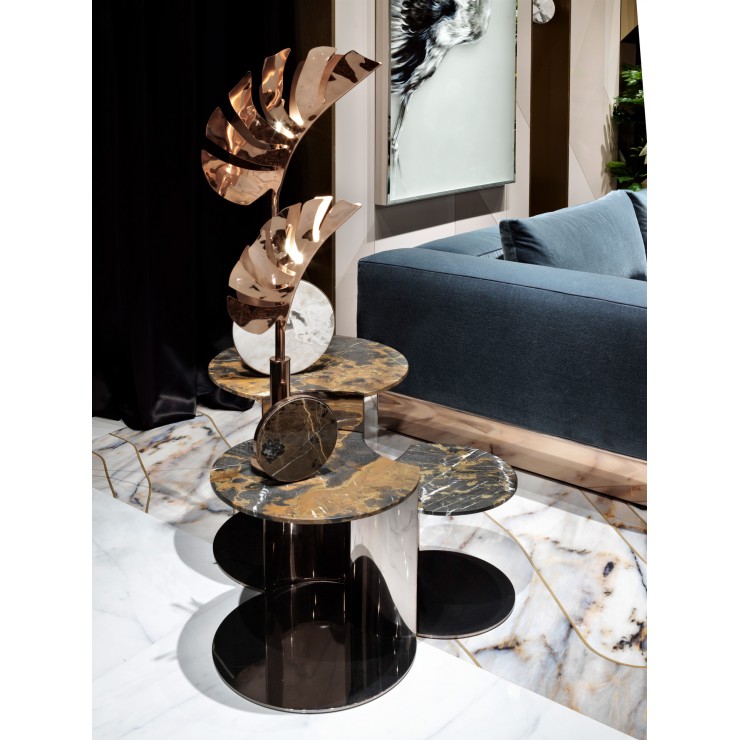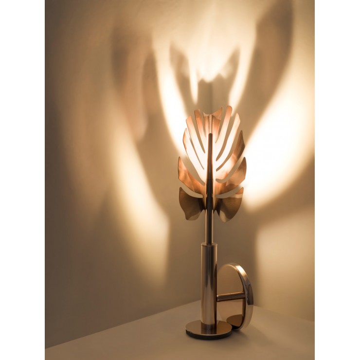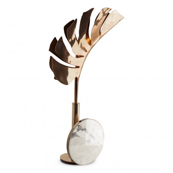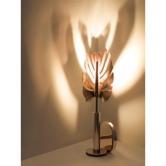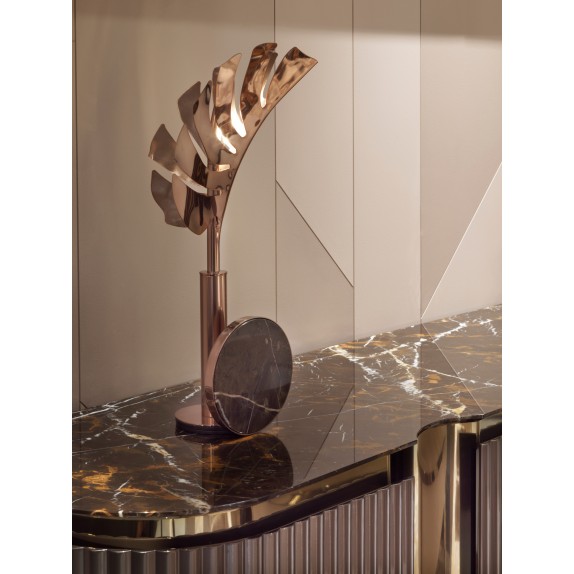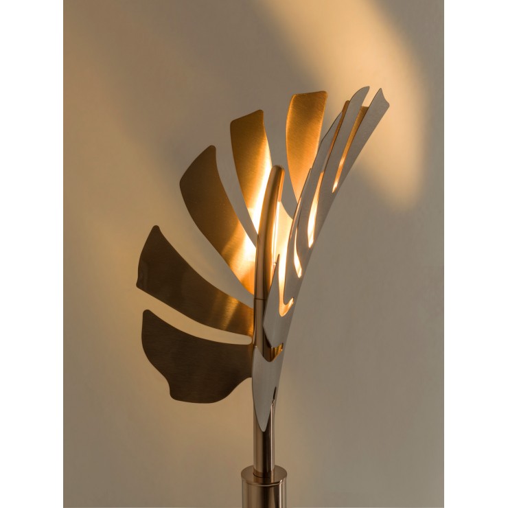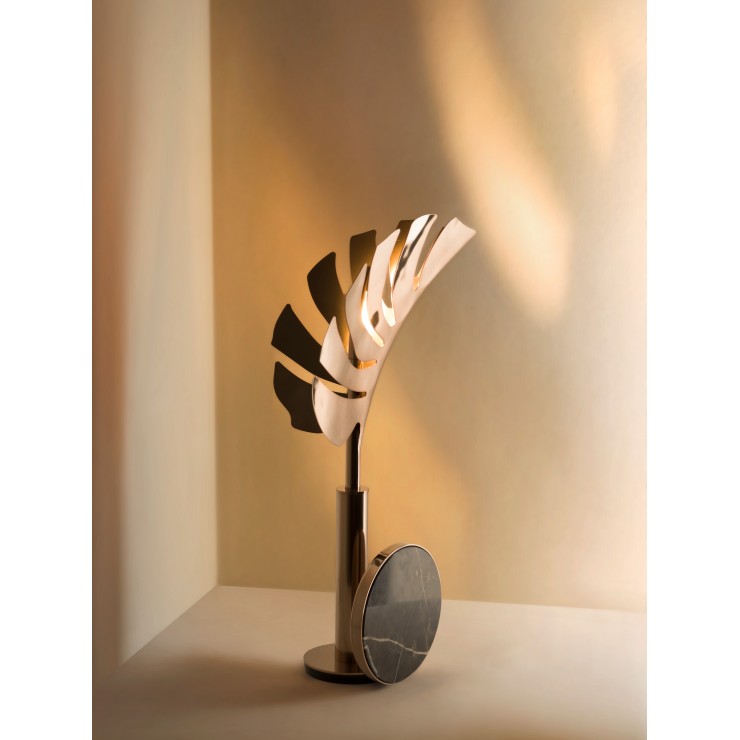 Lampe en acier inoxydable avec diffuseur en forme de feuille, obtenu à partir d'une fine couche finie à froid, avec surface brillante avec effet "métal liquide", intérieur satiné avec surface anti-éblouissante. Tige centrale avec éclairage LED COB d'une puissance de 3W. Base en métal avec lest et élément décoratif en marbre. Les pièces métalliques peuvent être laquées dans n'importe quelle couleur incluse dans la sélection de finitions métalliques. Ce modèle est équipé de sources lumineuses LED longue durée intégrées dans la structure de la lampe, qui ne peuvent pas être remplacées par l'utilisateur.