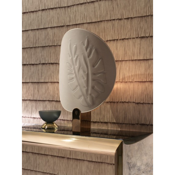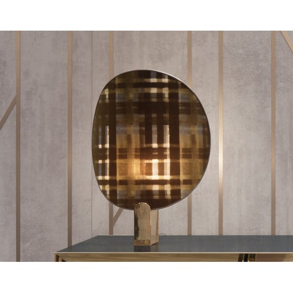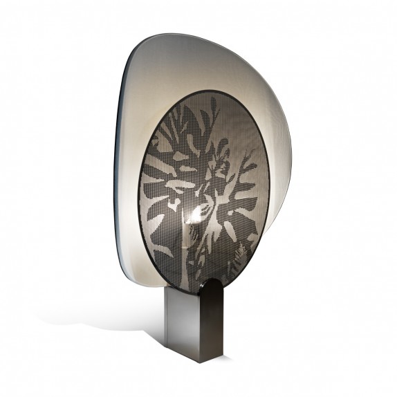 Lampe de table à une lumière avec base en métal poli ou satiné, avec abat-jour vertical en forme d'éventail concave en tissu imprimé floral (disponible également selon l'échantillon de tissu), avec diffuseur interne en moiré ivoire. Abat-jour arrière anti-éblouissant en acier inoxydable micro-perforé à texture graphique florale. Douille en laiton tourné et ampoule G9 40W avec diffuseur en verre. Pièces métalliques disponibles dans la sélection de finitions métalliques.