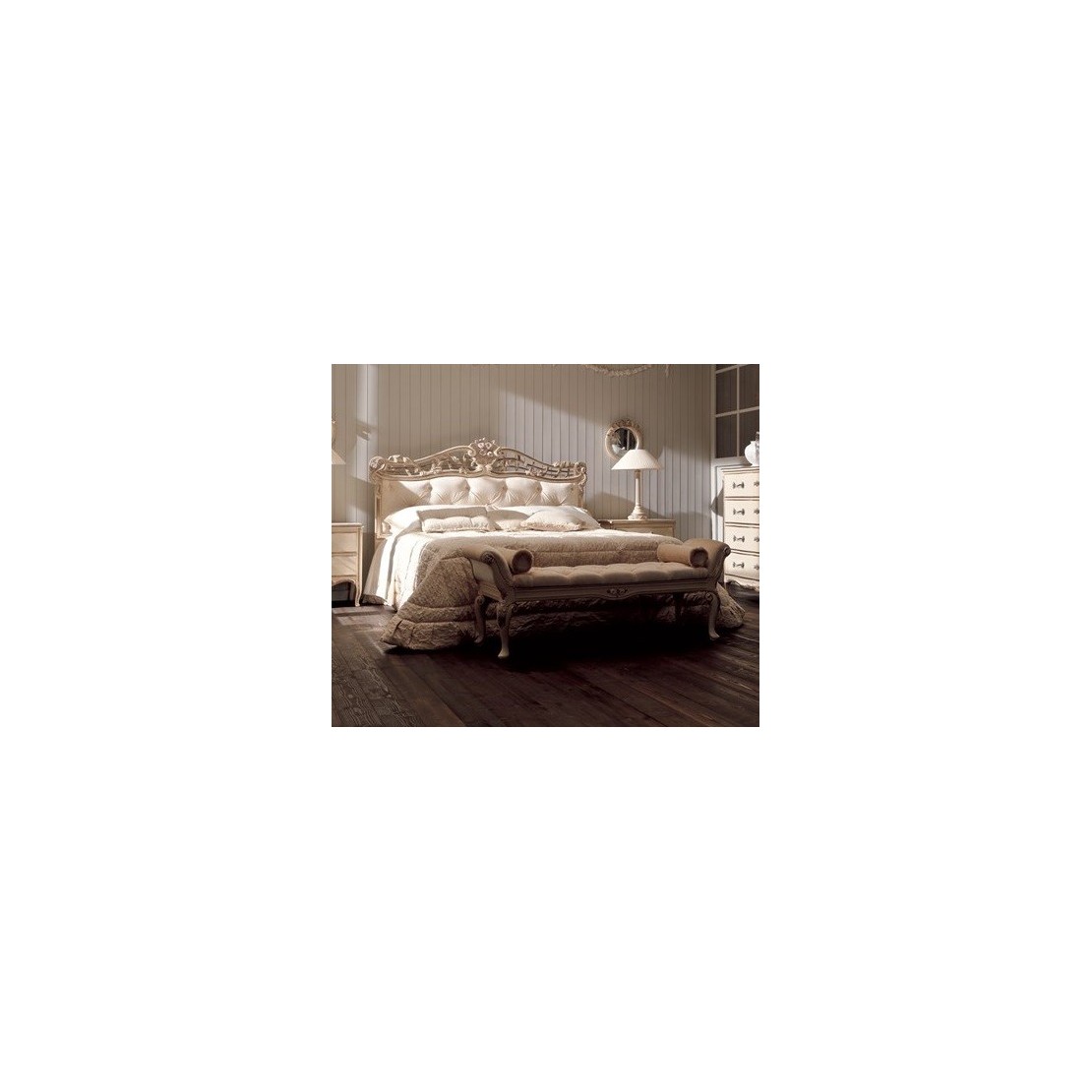 Lit 1773 de la collection Savio Firmino, lit au charme classique enrichi par des matériaux raffinés, tête de lit realisée en velours capitonné large. La particularité de la sculpture très élégante de la tête de lit est de grande classe, la couleur particulière du vermeille et du sable rehausse la beauté de ce lit merveilleux. Cadre de lit et pied de lit en bois, sommier à lattes en bois. L.194 P.209 H.152 (pour matelas de 170/200 cm).