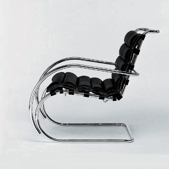 Fauteuil 325 MIES VAN DER ROHE L. - MVSEVM. Structure en tube d'acier chromé ou laqué. Coussin en mousse de polyuréthane, revêtu en peau ou tissu et fixés sur sangles de cuir. Dimensions: L 60 cm P 92 cm H 84 cm.