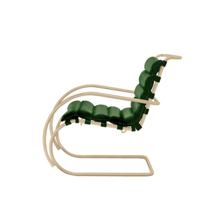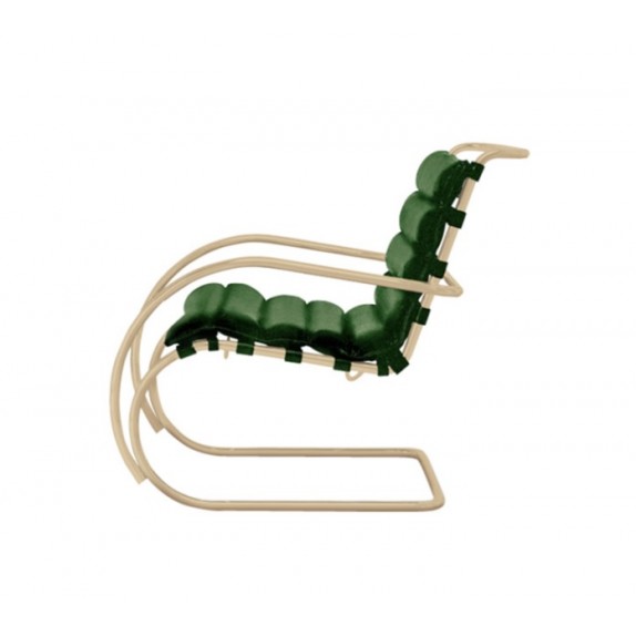 Fauteuil 325 design par MIES VAN DER ROHE L. - Collection MVSEVM. Structure en tube d'acier chromé ou laqué. Coussin en mousse de polyuréthane, revêtu en peau ou tissu et fixés sur sangles de cuir. Dimensions: L 60 cm P 92 cm H 84 cm.