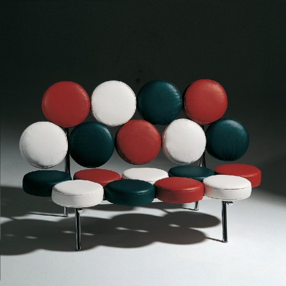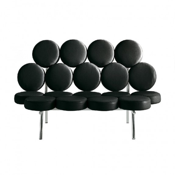 Canapé 484 NELSON G. - MVSEVM. Structure en tube d'acier chromé avec traverses laquèes ou avec structure toute laquée. Rembourrage en mousse de polyuréthane et dacron. Revêtement en peau ou en similcuir. Dimensions: L 158 cm P 85 cm H 96 cm.