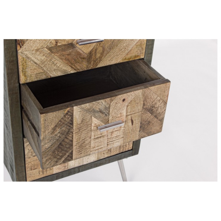 Structure en bois de Mango . Dossiers et intérieurs des tiroirs MDF. Petits pieds à assembler en Fer. Poignées en métal . finition à base de nitrocellulose -