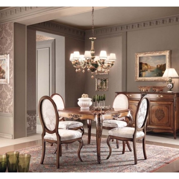 Table LCG 2004, structure en bois, forme carrée, extensible, décorations florales sculptées, finition Luxury en cerisier. L.110/160 P.110 H.79.