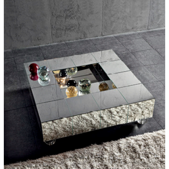 Table basse MM.9309, structure en bois recouverte de miroir, jambes sphériques en verre de Murano, L.120 P.120 H.37.