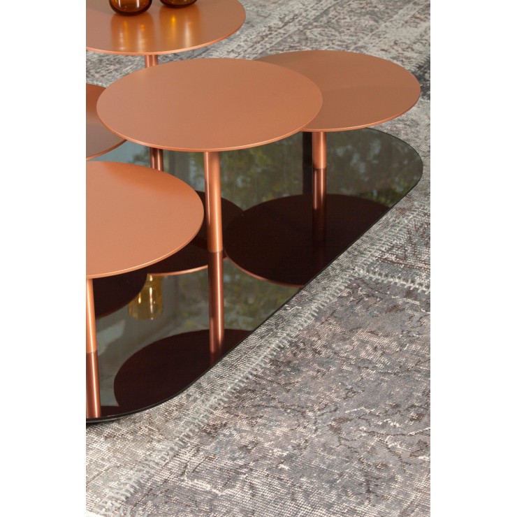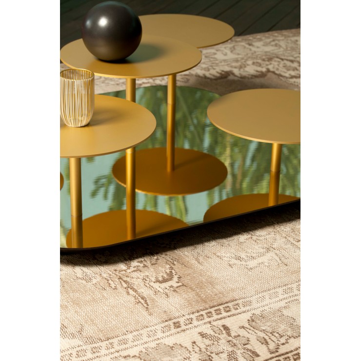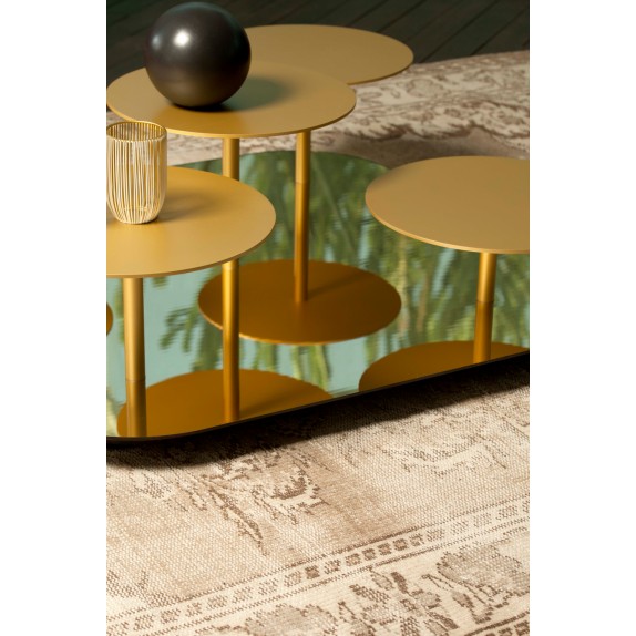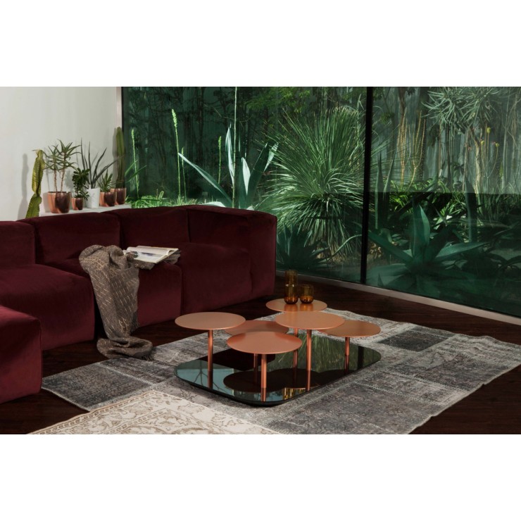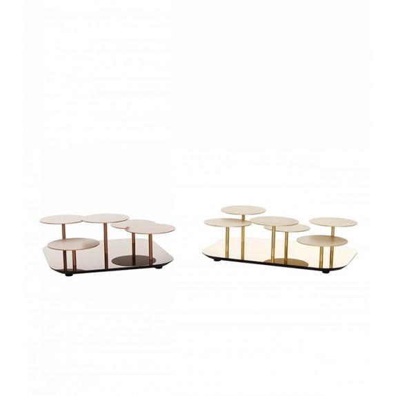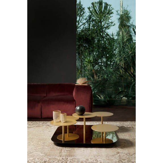 Valentina évoque les lacs calmes de l'Amérique équatoriale, les grandes feuilles flottant sur les miroirs d'eau ,et la multitude de couleurs et de lumière qui se propagent dans la broussaille. Une série de tables basses reposant sur une base carrée ou rectangulaire , qui accorde la force minimaliste du métal avec la lumière,les couloeurs crées par un miroir.