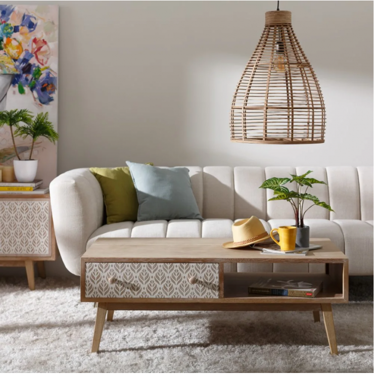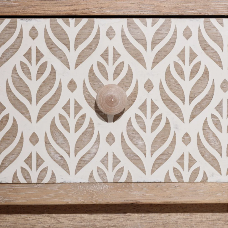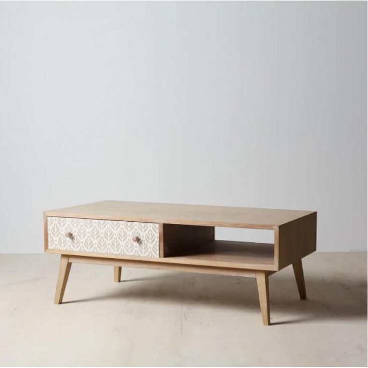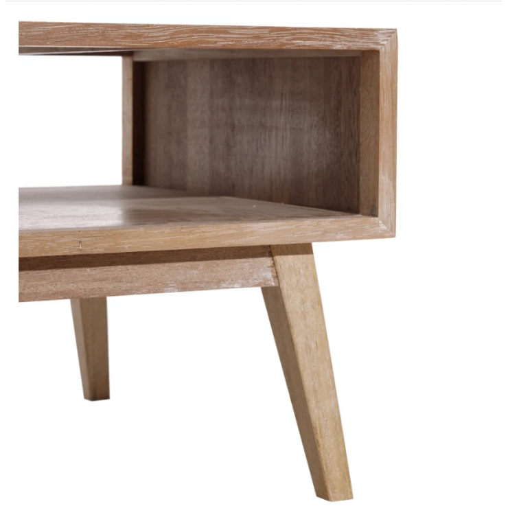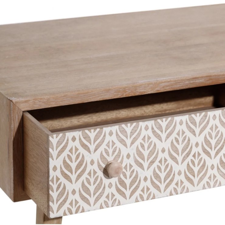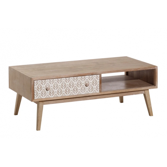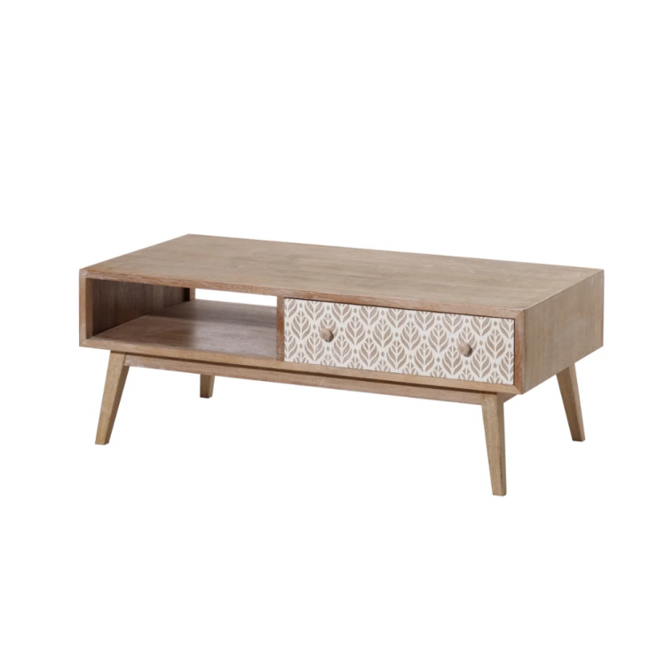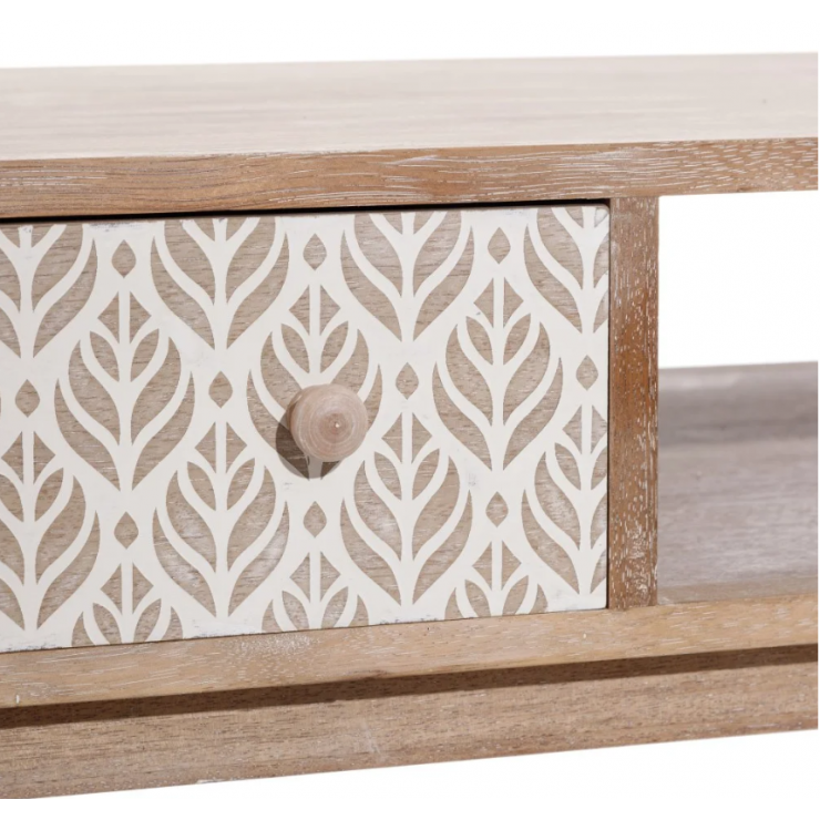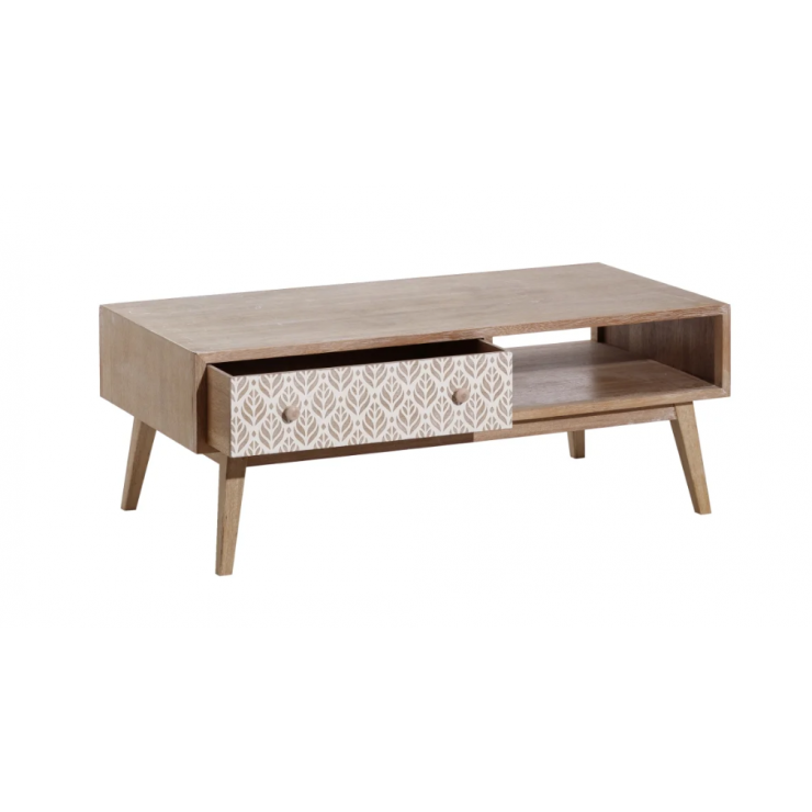 Table basse 151.293 structure en bois de paulonia,1 tiroir et 1 compartiment ouvert, finition natural avec décor blanc , L.120 P.60 H.45.