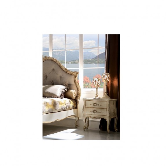 Table de chevet Silvano Grifoni avec 2 tiroirs, finition Décapé et couleur Or , avec de belles sculptures floréales. L.63 P.37 H.66.