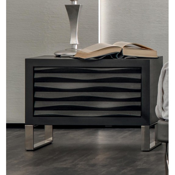 Table de chevet Ebon à 1 tiroir toujours à motif à vague et avec système de fermeture soft ,pieds carrés 3.11 , finition laqué fer naturel cat.B .Structure en bois massif noyer Tulipier , L.60 P.40 H.44